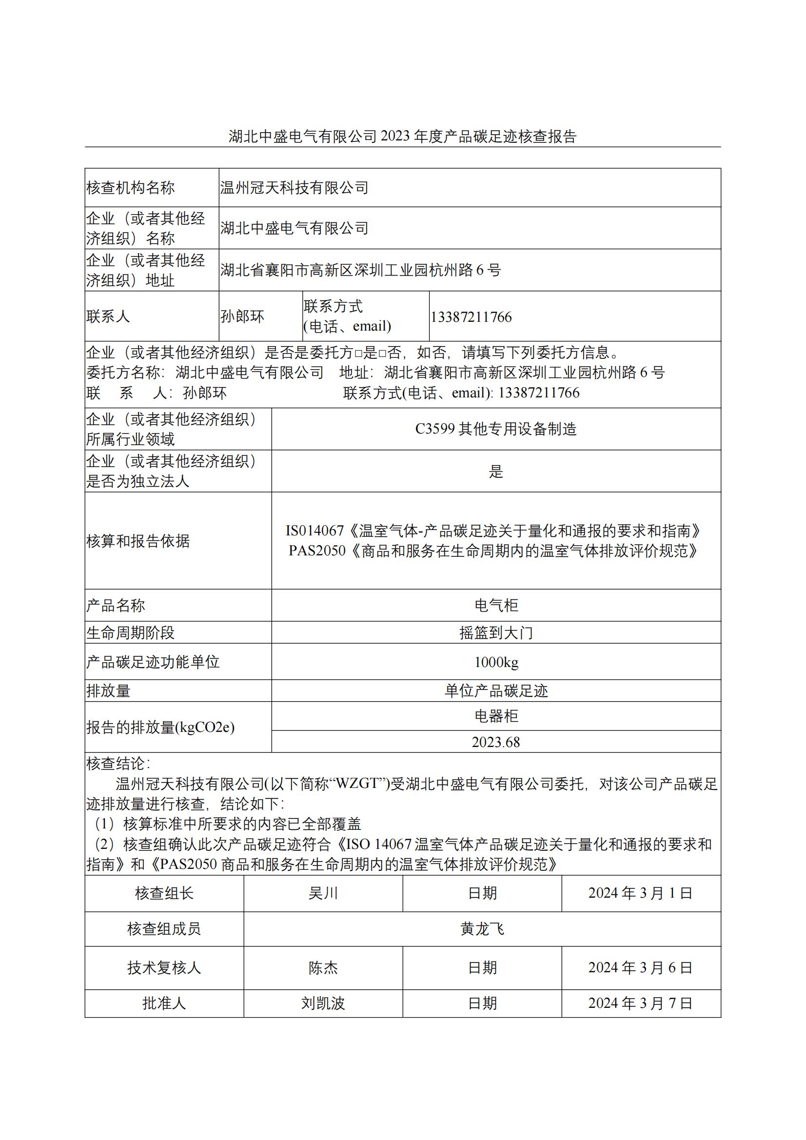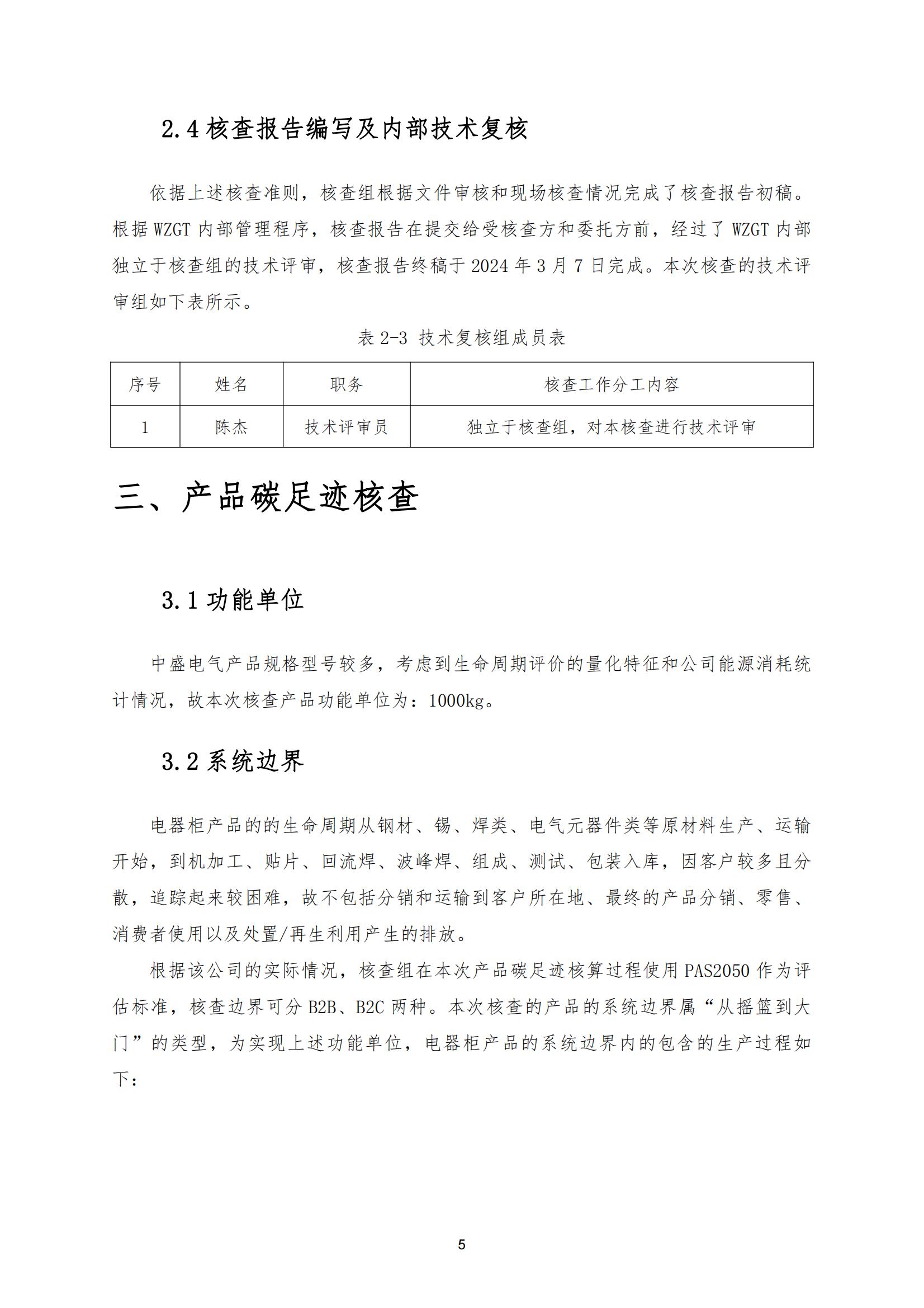 (公示)中盛电气2023年度产品碳足迹核查报告